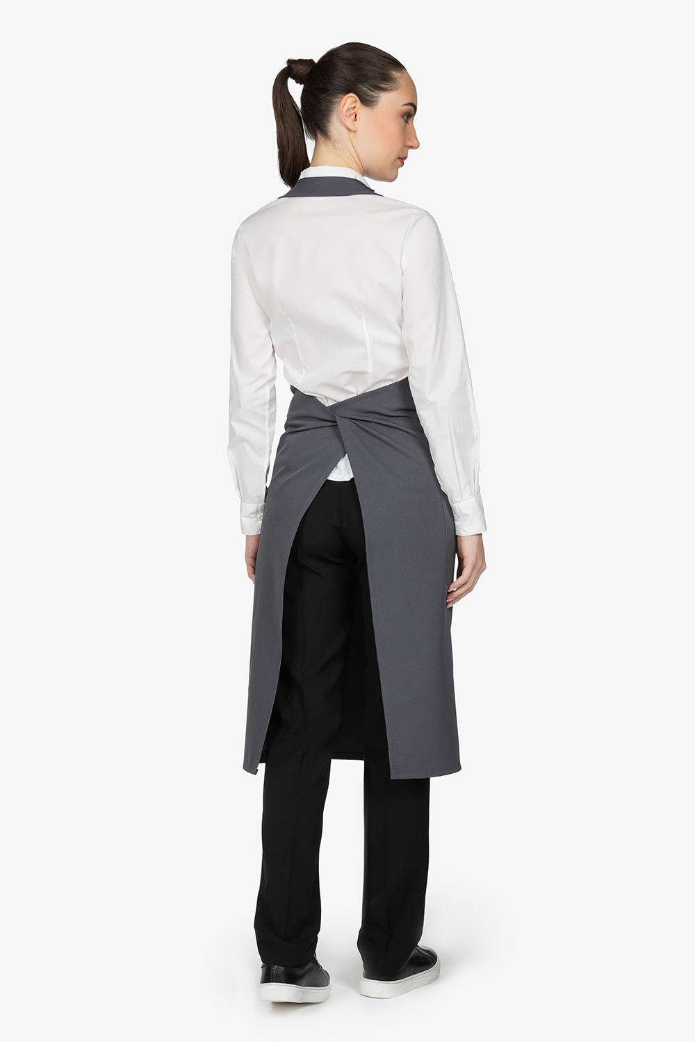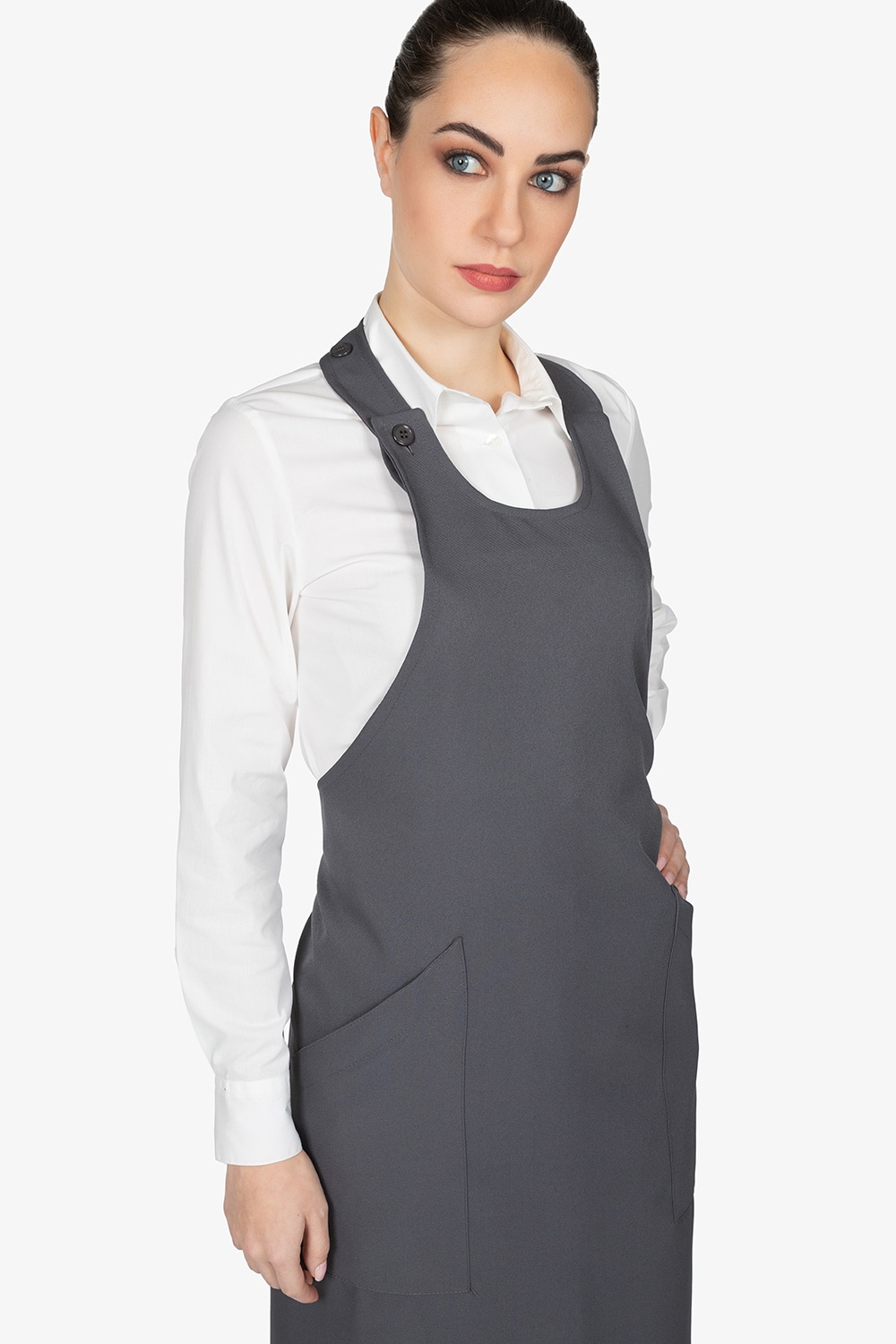 Grembiule grigio con pettorina. Due tasche frontali. Chiusura regolabile con bottoni sullo spallaccio. Allacciatura in vita con lacci.