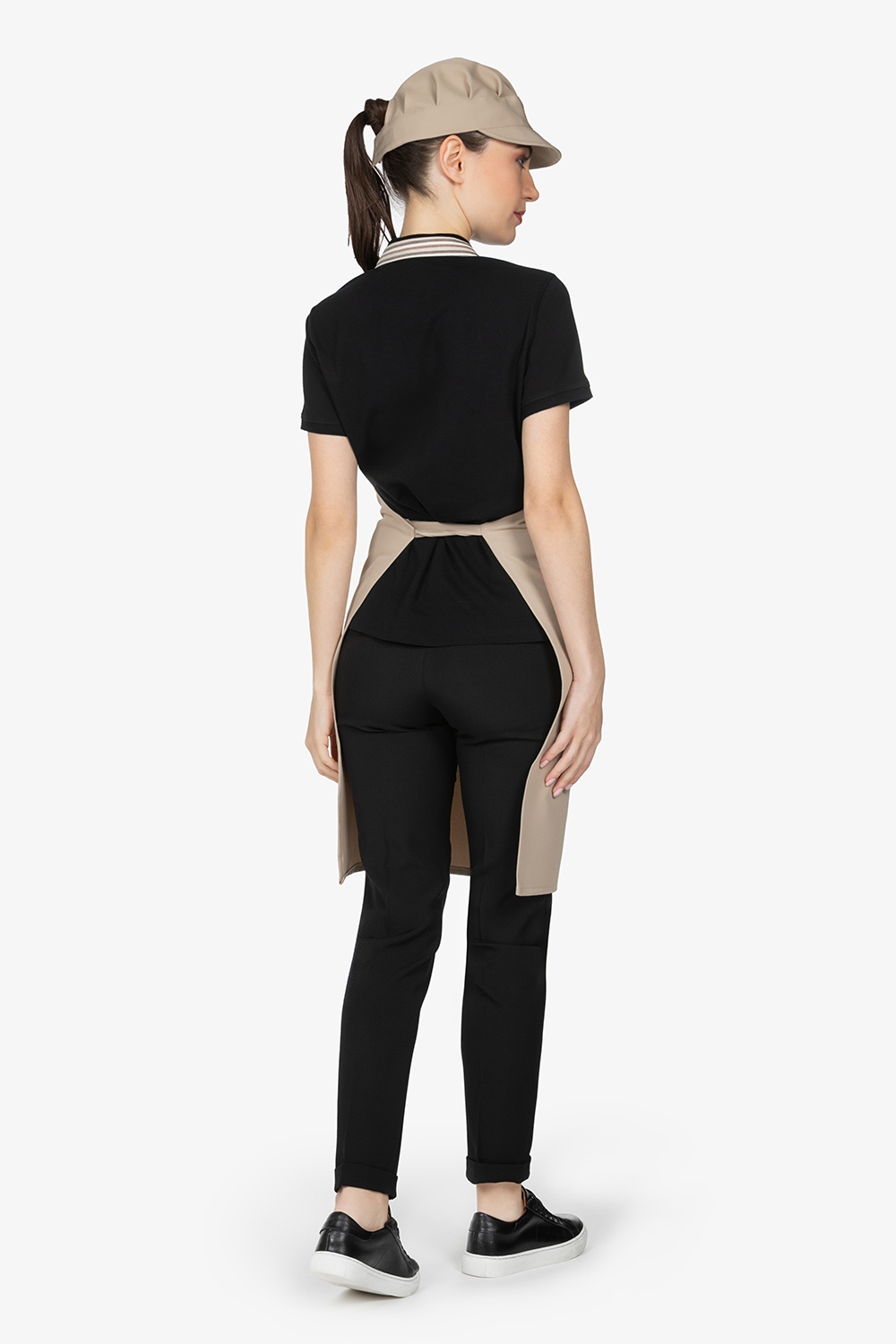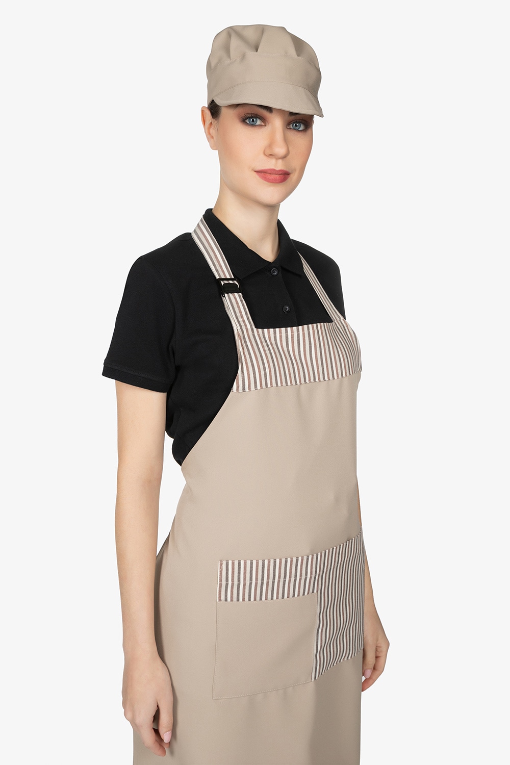 Altezza: 80cm – Larghezza: 70cm. Grembiule beige con pettorina. Collo regolabile con fibbia. Doppia tasca sormontata bicolore, in contrasto colore.