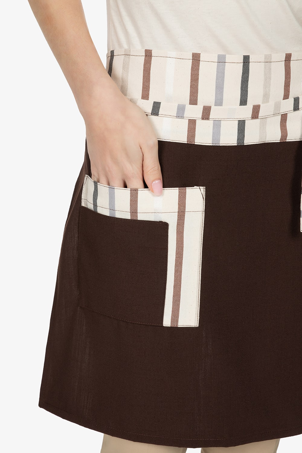 Altezza: 50cm – Larghezza: 75cm. Grembiule a vita marrone. Fascia in contrasto colore. Doppia tasca sormontata bicolore, in contrasto colore.