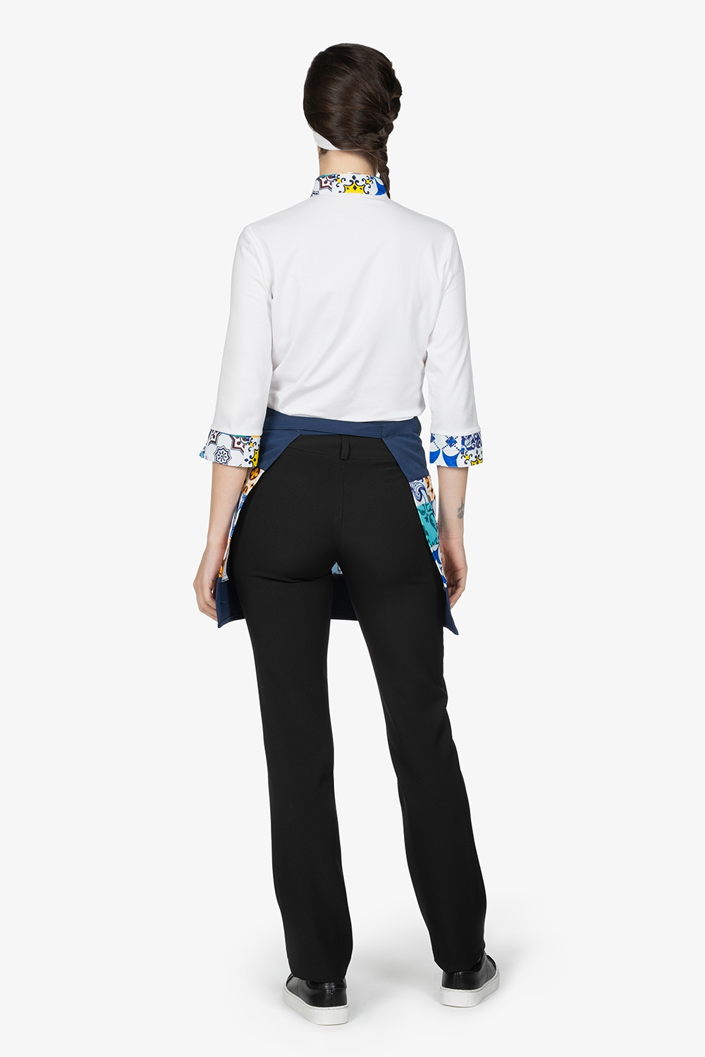 Altezza: 83cm – Larghezza: 70cm. Grembiule a vita blu. Due tasche nascoste nella fascia a contrasto.
