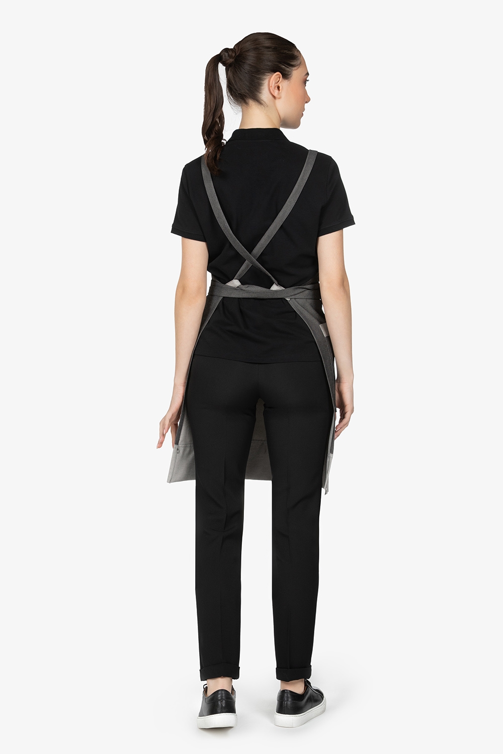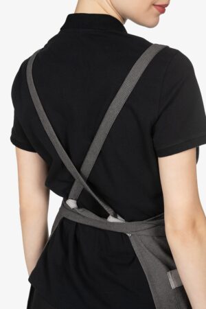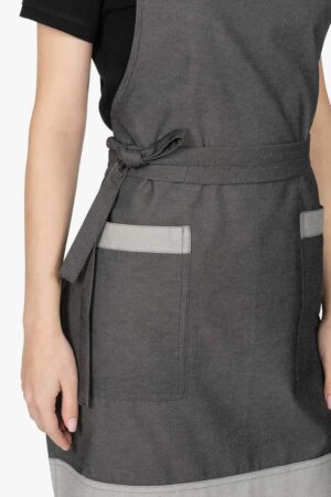 Grembiule con pettorina in grigio scuro effetto “jeans”. Due bretelle con incrocio sulla schiena. Due tasche laterali. Colori a contrasto sul bordo e sulle tasche.
