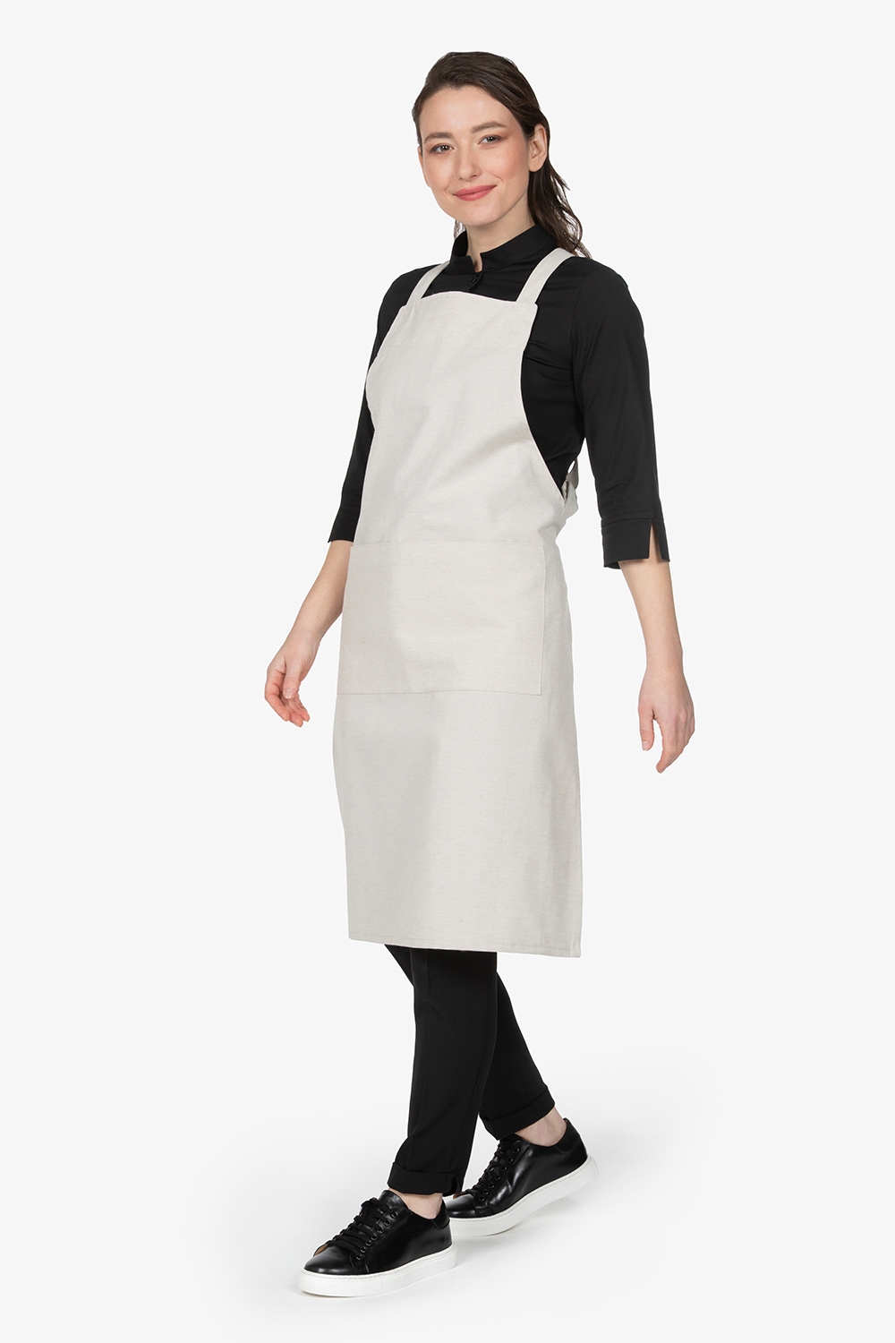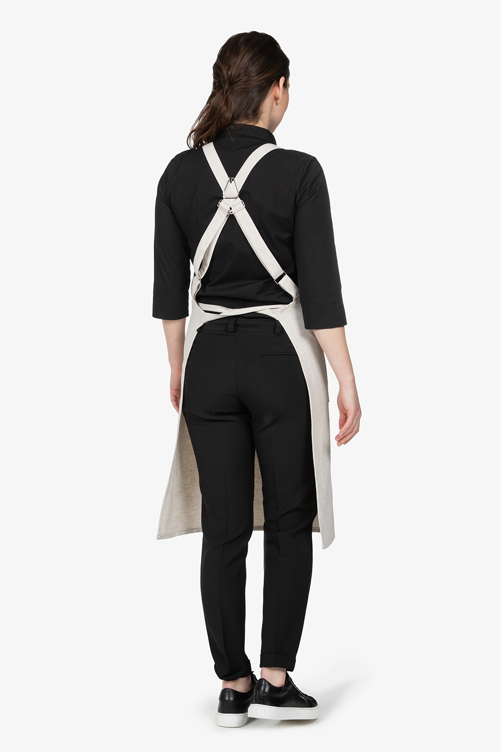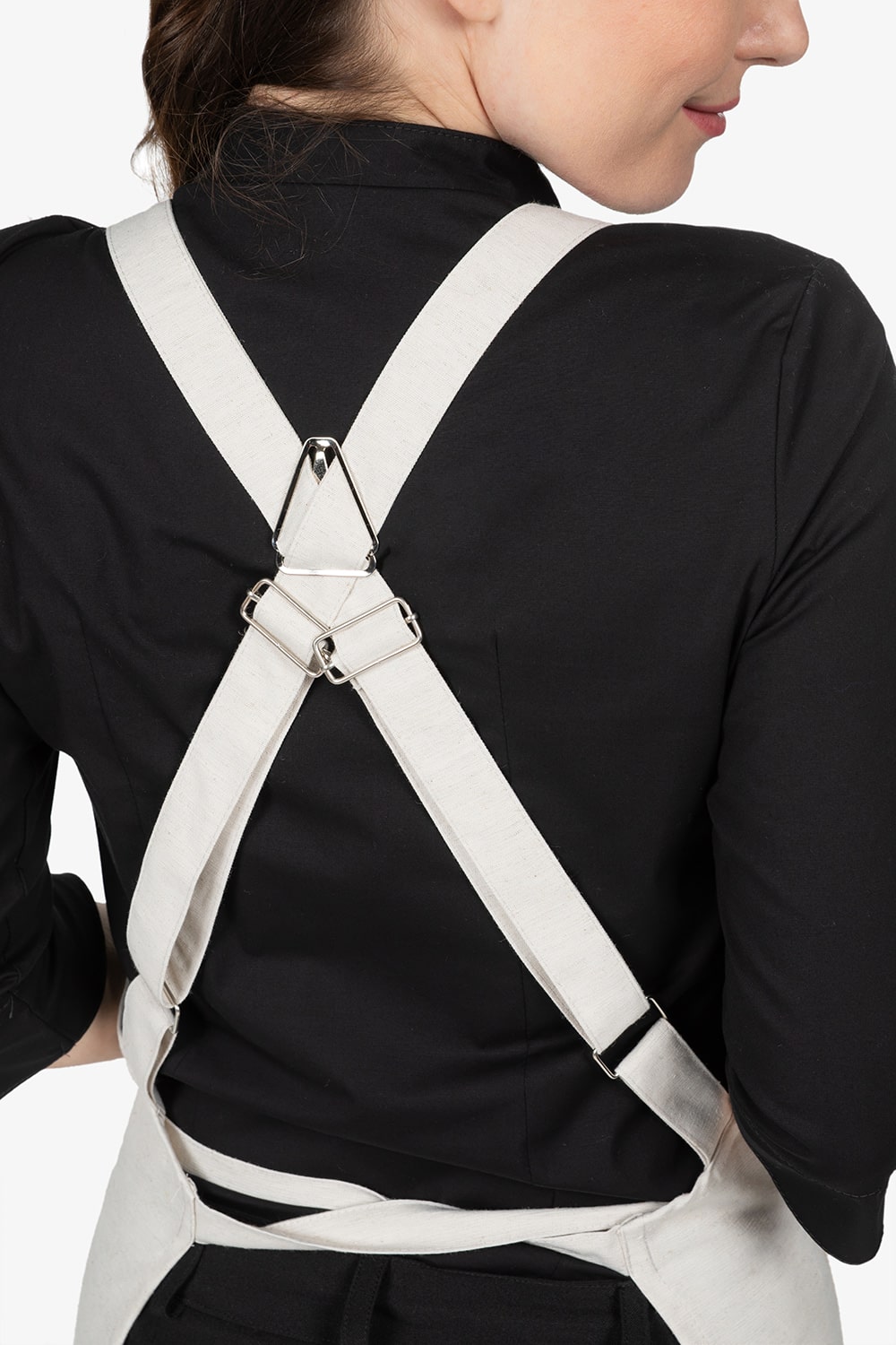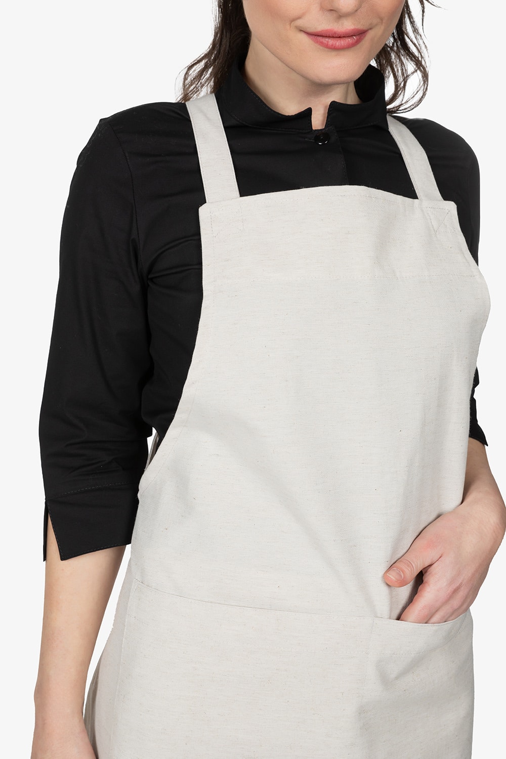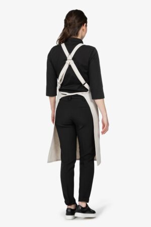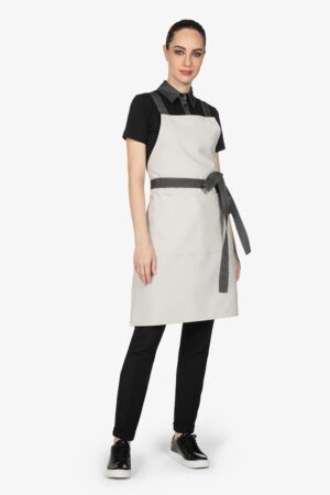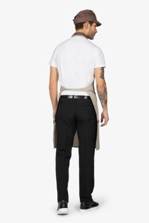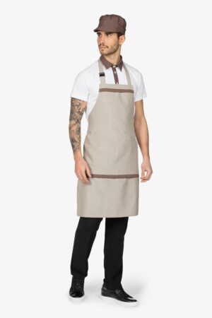 Altezza: 91cm – Larghezza: 68cm. Grembiule con pettorina in beige. Due bretelle regolabili con fibbia incrociate sulla schiena. Tascone centrale diviso in due. Allacciatura posteriore.