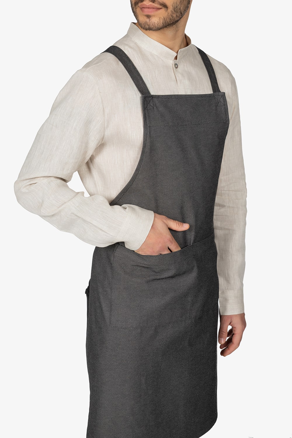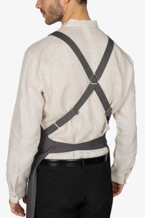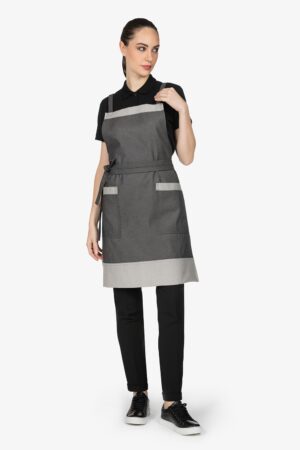 Altezza: 91cm – Larghezza: 68cm. Grembiule con pettorina in grigio scuro effetto “jeans”. Due bretelle regolabili con fibbia incrociate sulla schiena. Tascone centrale diviso in due. Allacciatura posteriore.