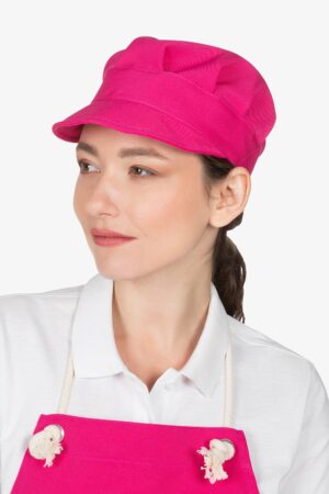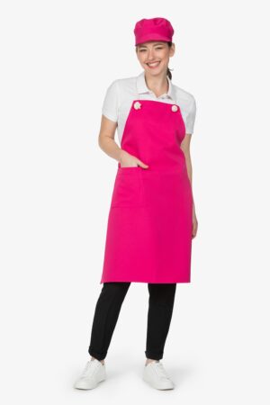 Altezza: 85cm – Larghezza: 68cm. Grembiule con pettorina in fucsia. Una tasca lato destro. Collo regolabile in corda.