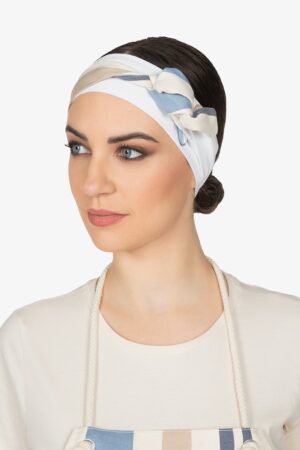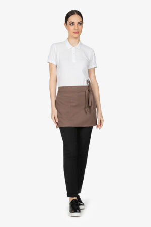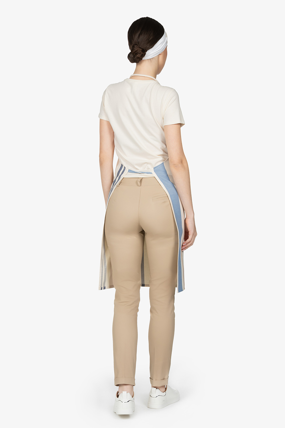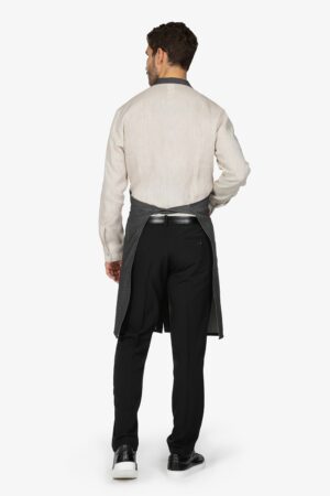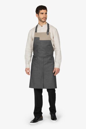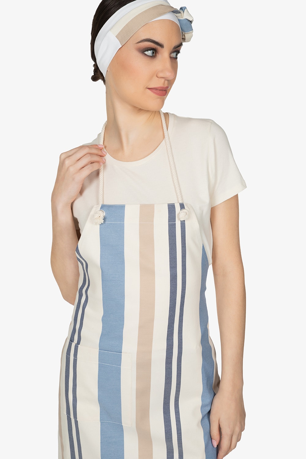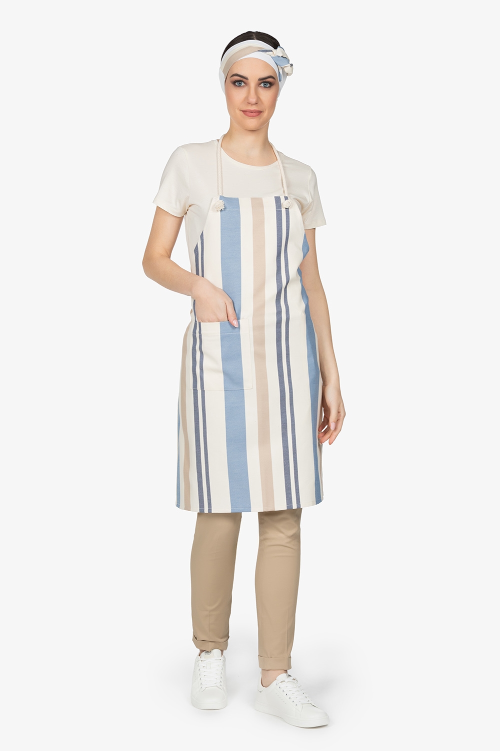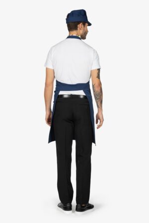 Altezza: 85cm – Larghezza: 68cm. Grembiule con pettorina in rigato azzurro. Una tasca lato destro. Collo regolabile in corda.