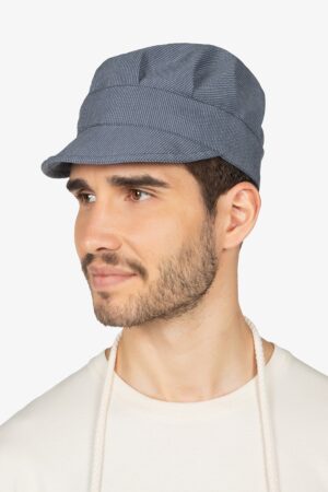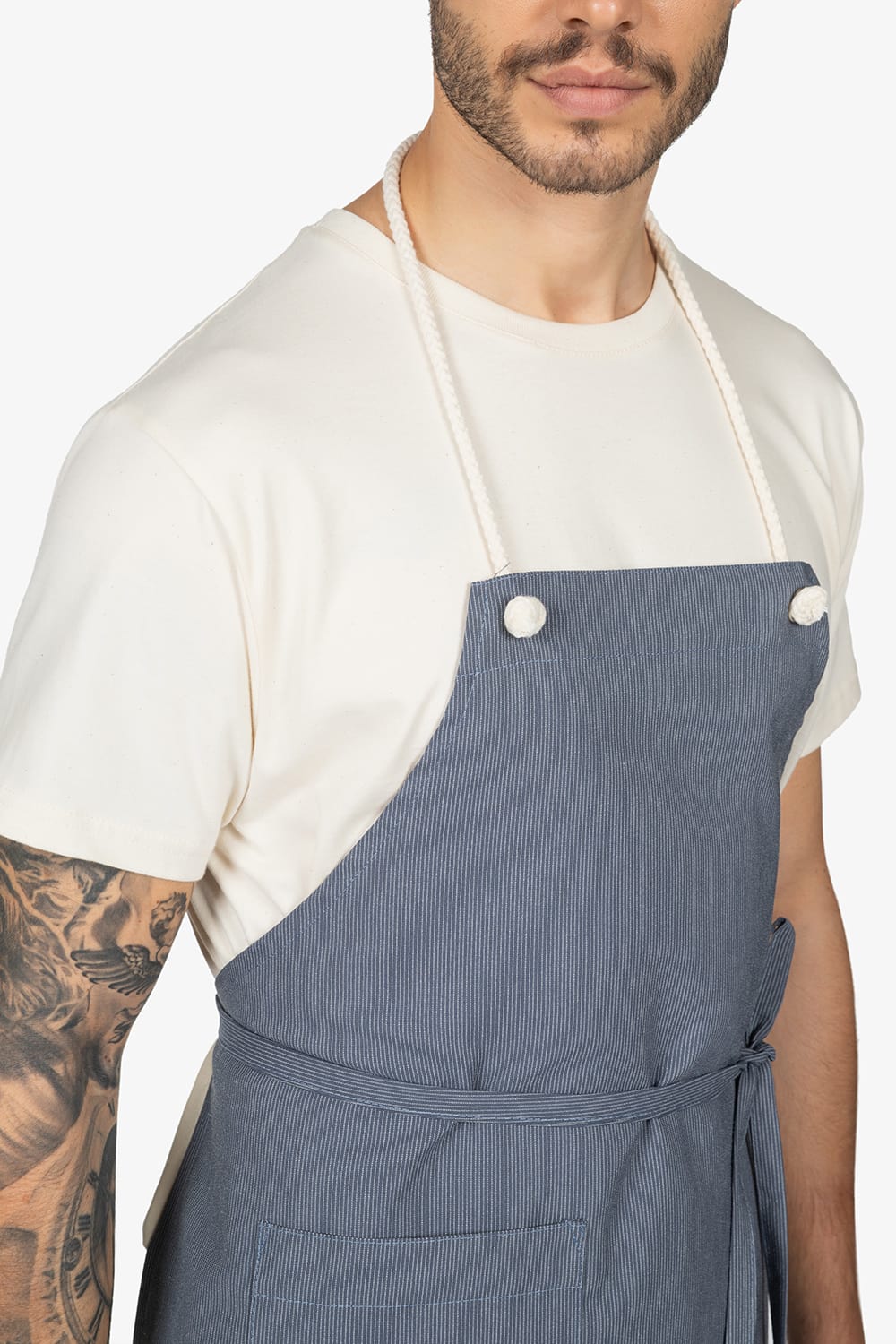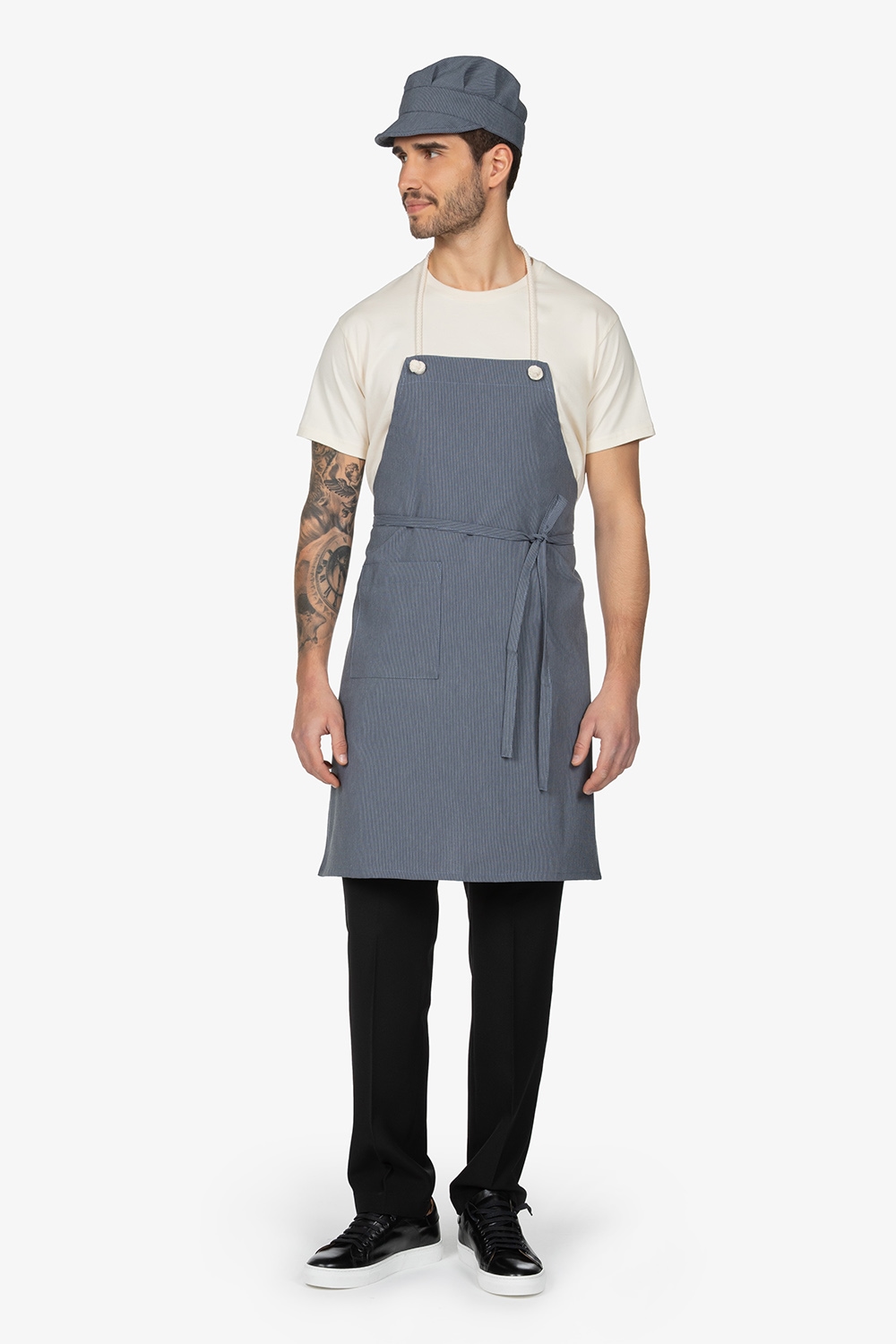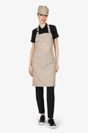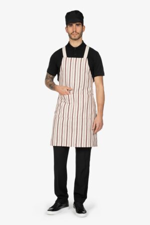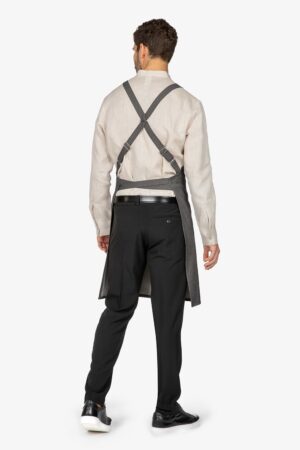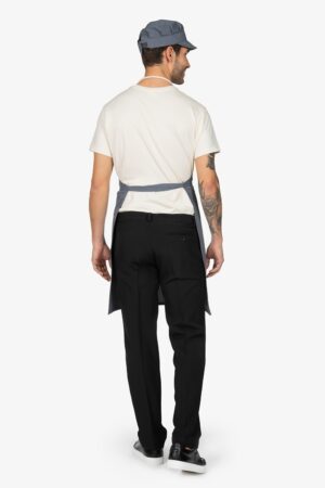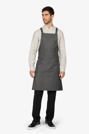 Altezza: 85cm – Larghezza: 68cm. Grembiule con pettorina in fantasia “riga grigia”. Una tasca lato destro. Collo regolabile in corda.