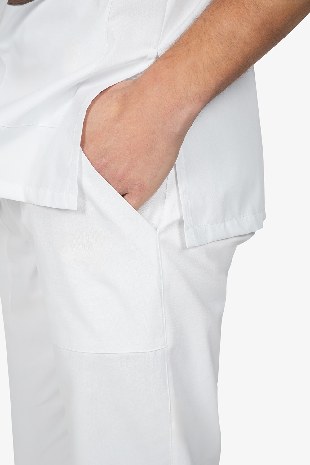 Pantalone bianco con vita elasticizzata e coulisse. Due tasche laterali alla carrettiera. Vestibilità regular, con gamba leggermente stretta sul fondo.