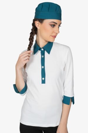 Polo con colletto a vela in contrasto. Manica a 3/4. Chiusura con 4 bottoni. Vestibilità regular.