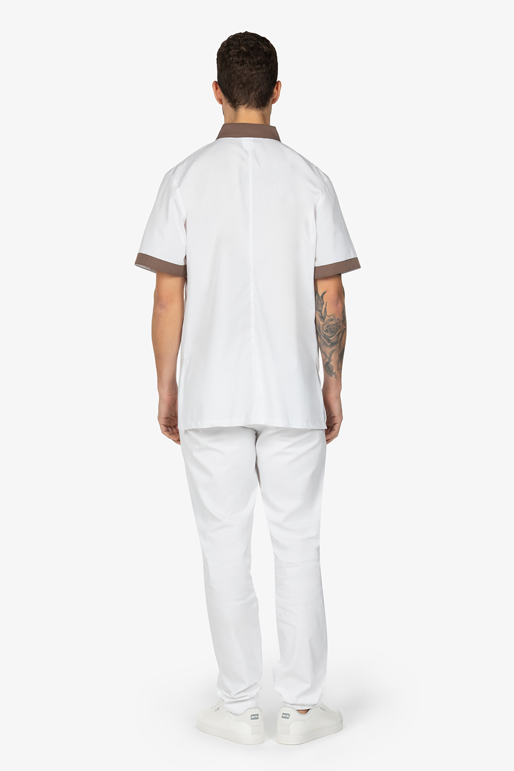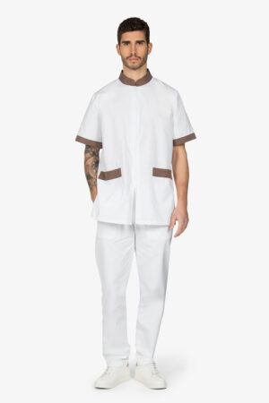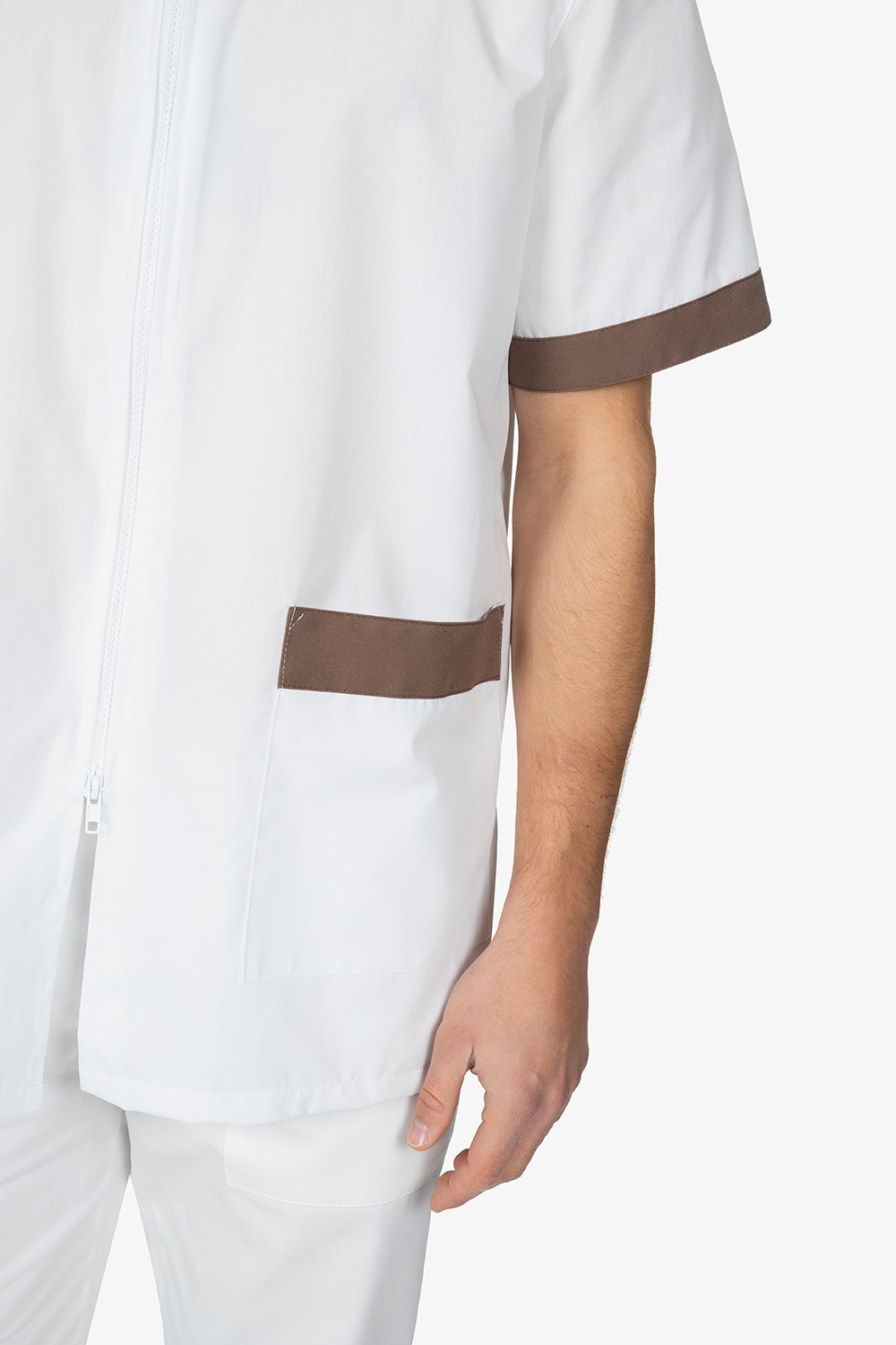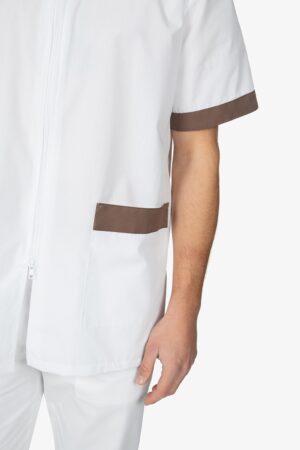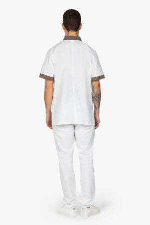 Casacca bianca con colletto alla coreana. Chiusura con cerniera a doppio cursore. Mezza manica. Due tasche a toppa. Dettagli in contrasto colore. Vestibilità regular.