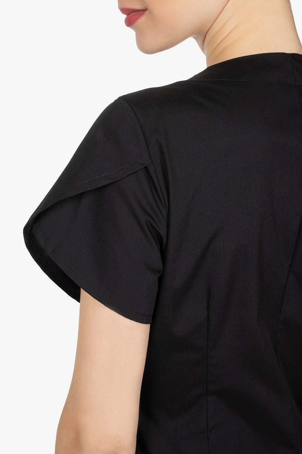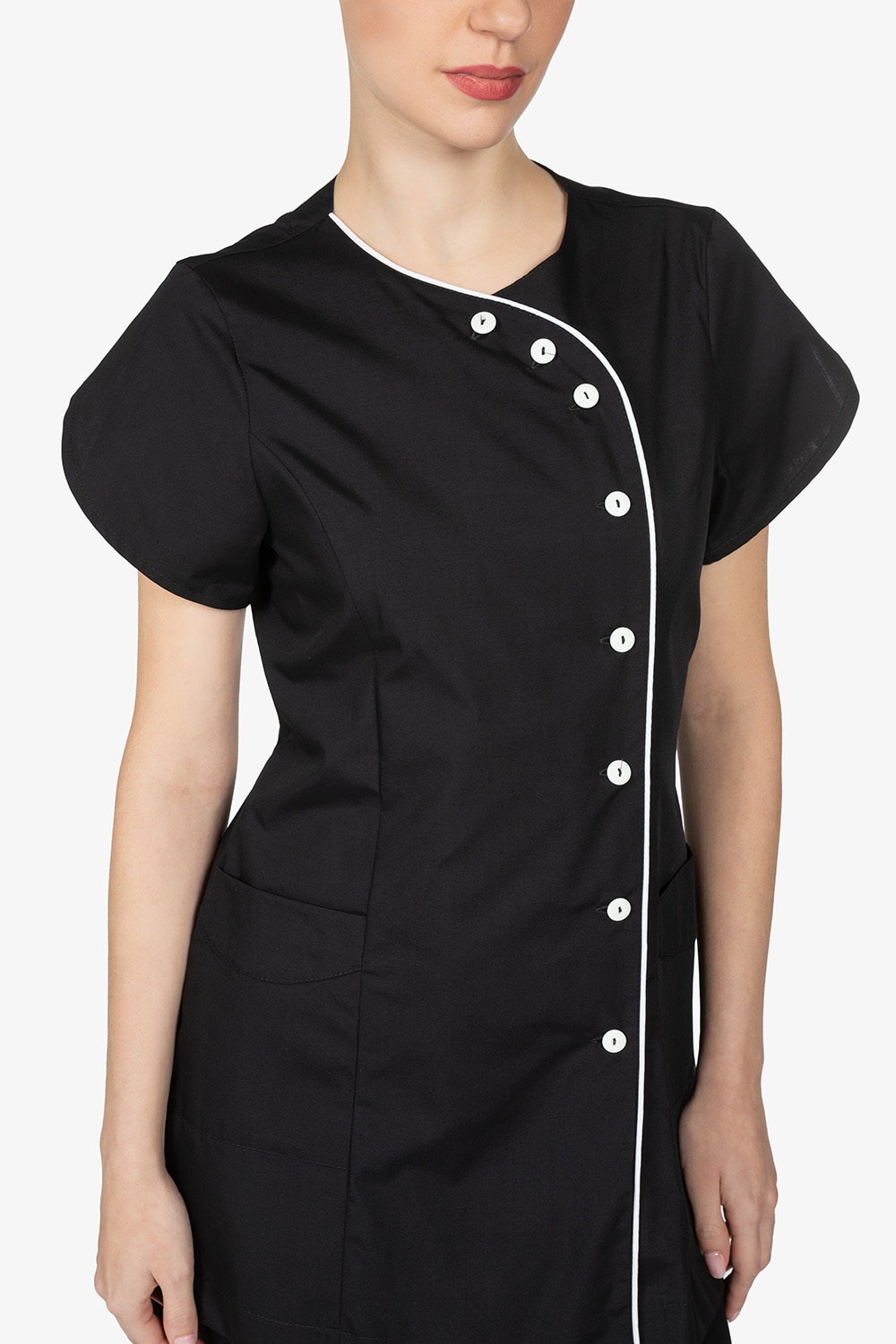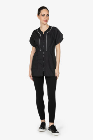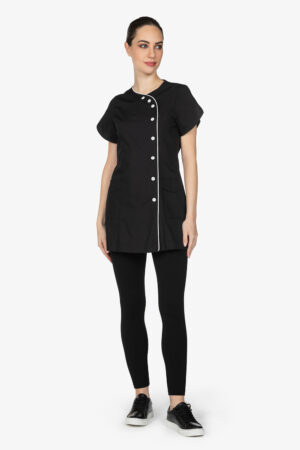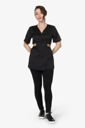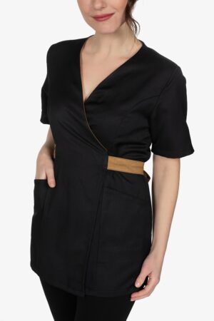 Casacca nera con colletto alla coreana. Mezza manica a farfalla. Due tasche a toppa. Abbottonatura laterale, simil doppiopetto. Filetto in contrasto lungo allacciatura. Vestibilità slim.