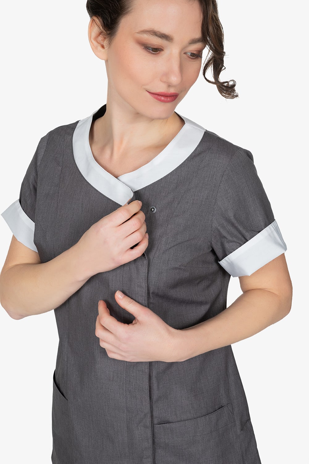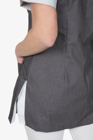 Casacca con scollo a barca in contrasto colore. Mezza manica con bordo a contrasto. Abbottonatura nascosta con bottoni a pressione. Due spacchi laterali a contrasto. Due tasche a toppa. Vestibilità regular.