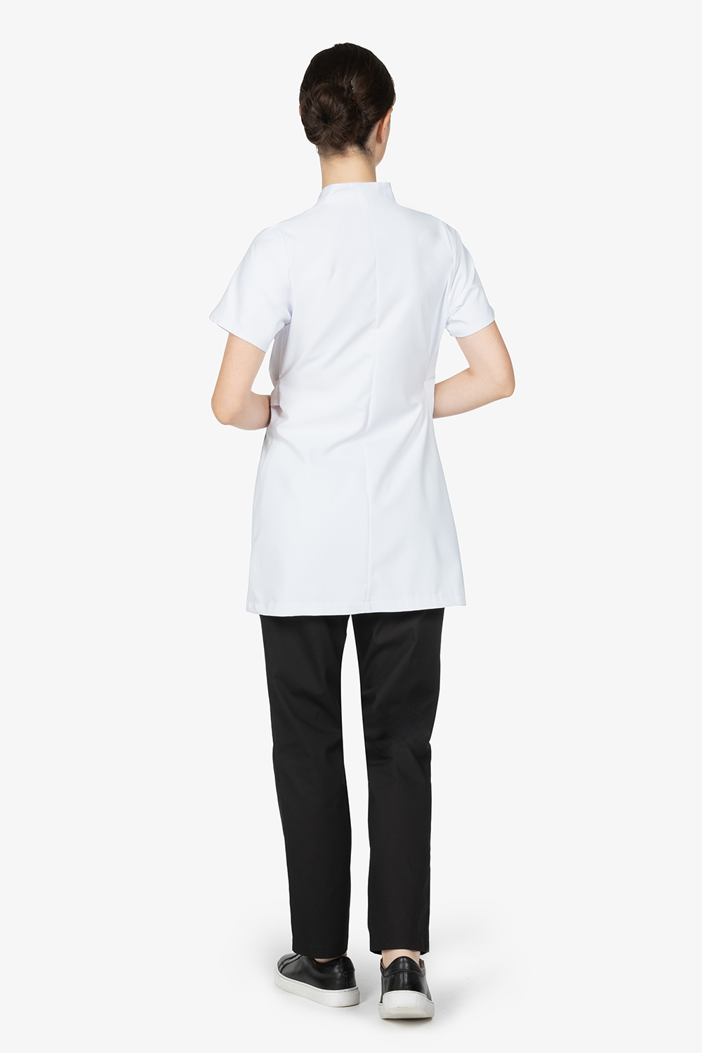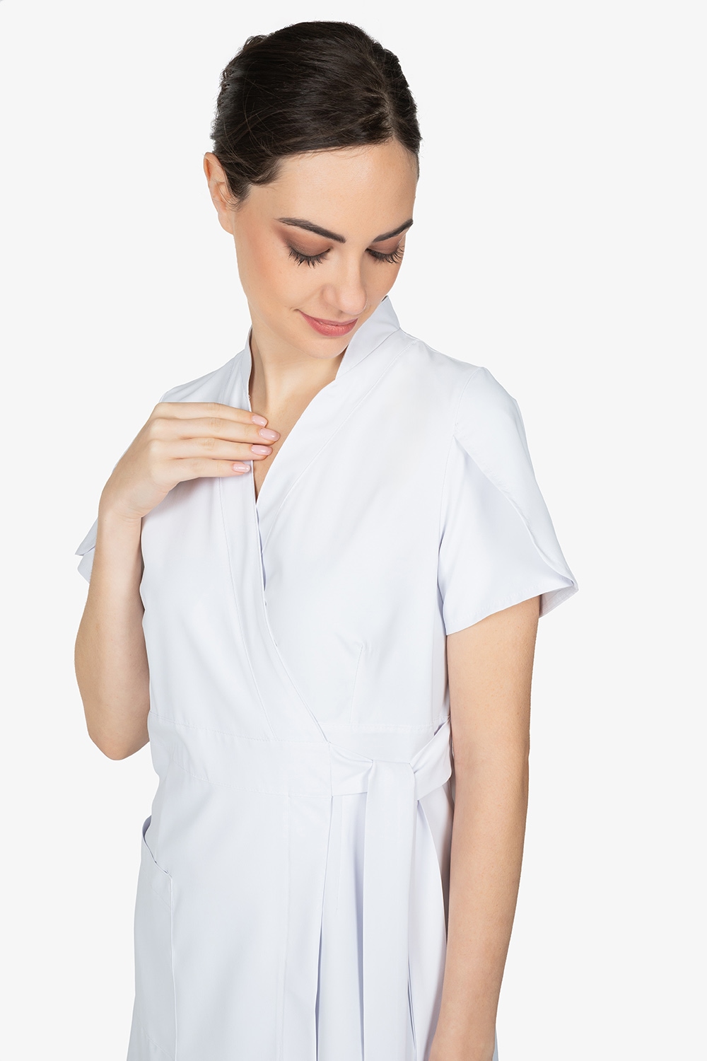 Kimono bianco a chiusura incrociata con laccetto interno e fiocco esterno. Mezza manica a farfalla. Una tasca laterale destra. Vestibilità regular.