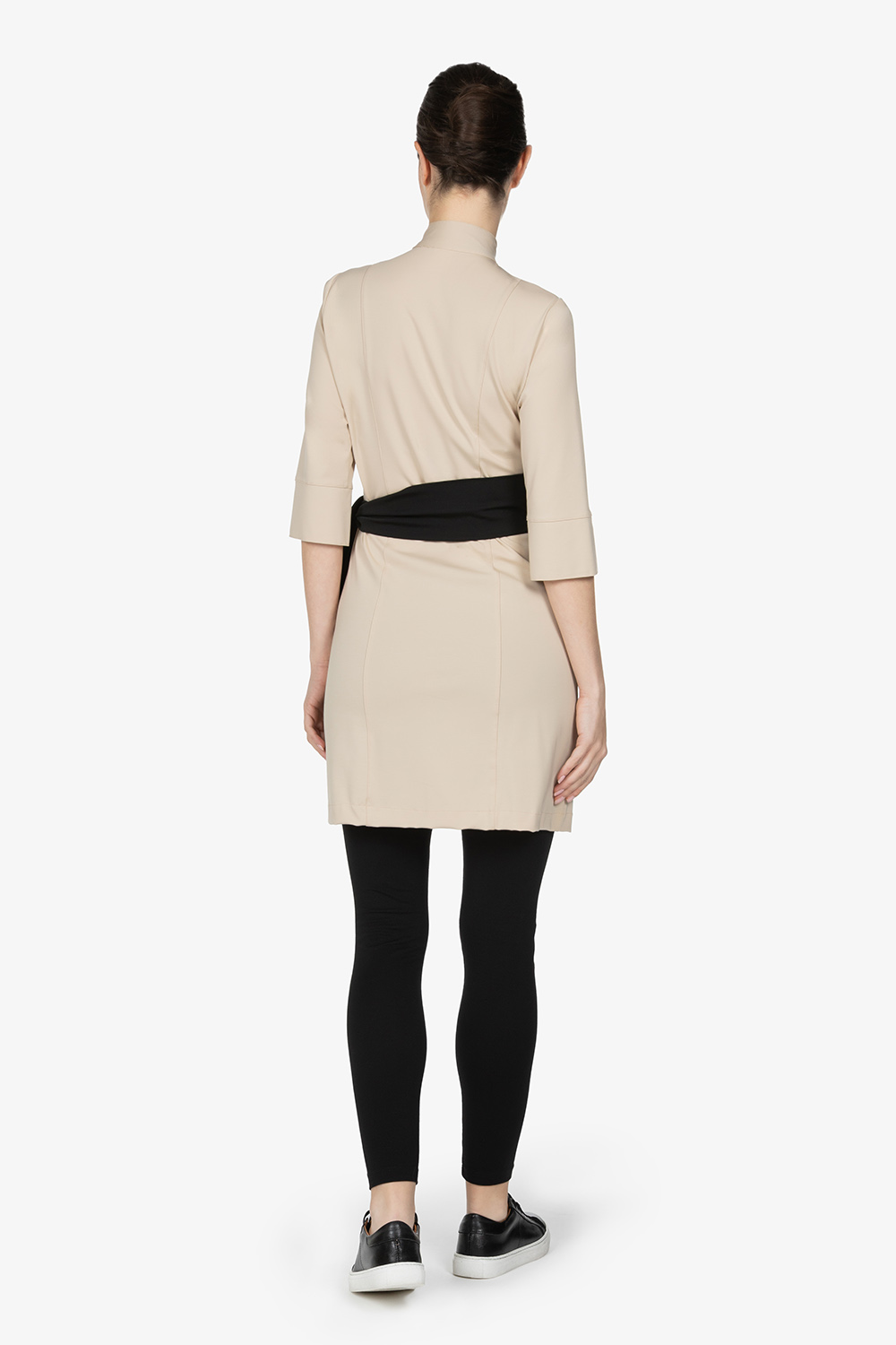 Casacca beige con colletto alla coreana. Abbottonatura nascosta. Manica a 3/4 con spacchetti su bordo. Pinces. Due tasche. Fusciacca a contrasto. Vestibilità regular.