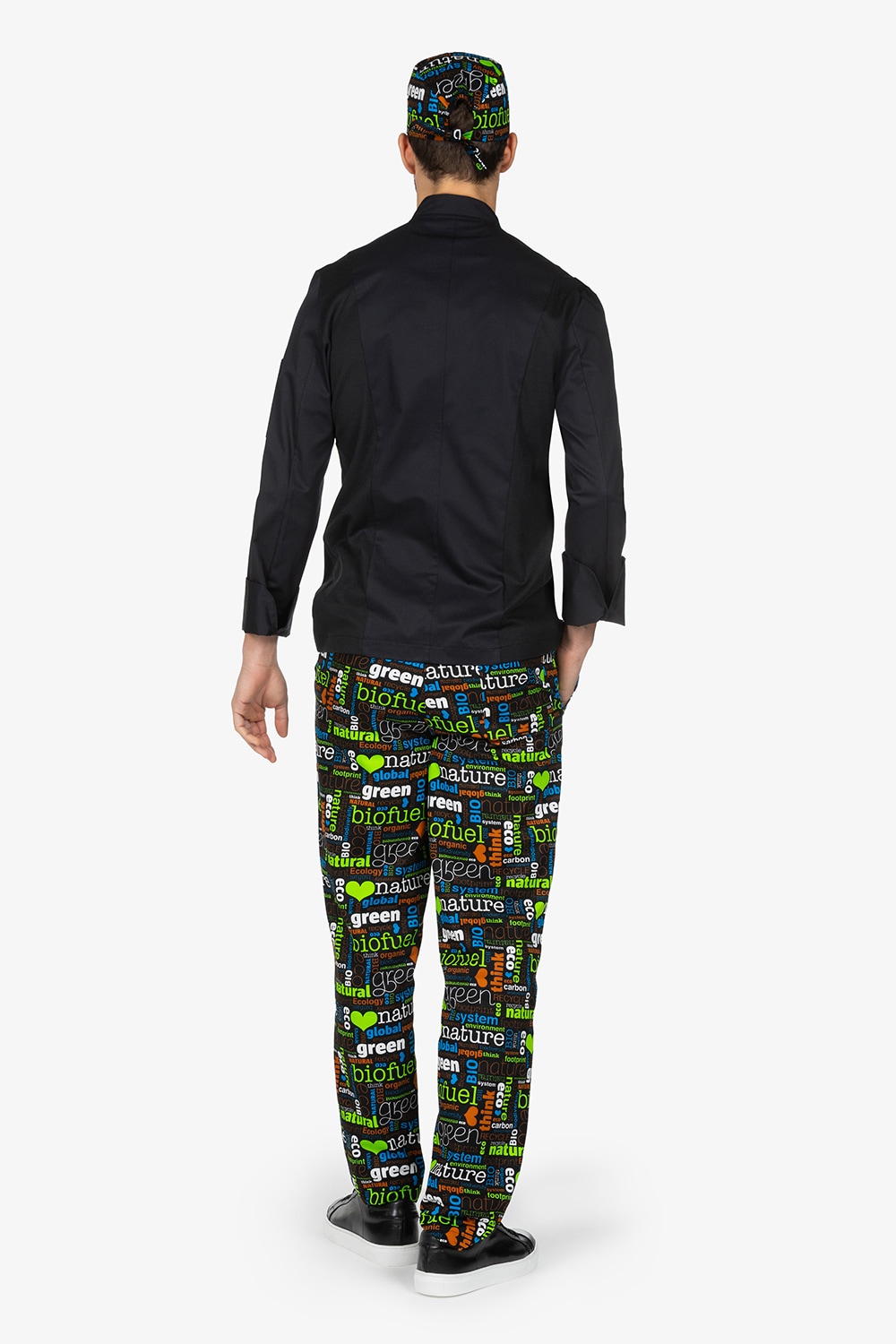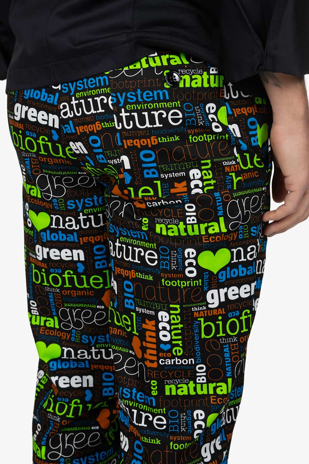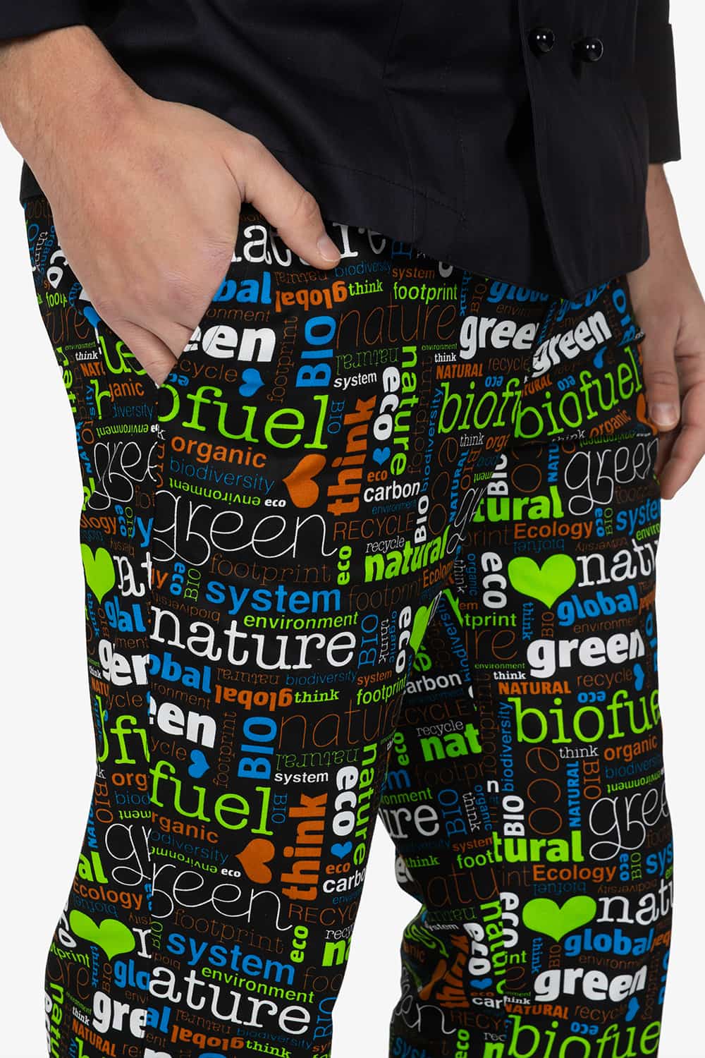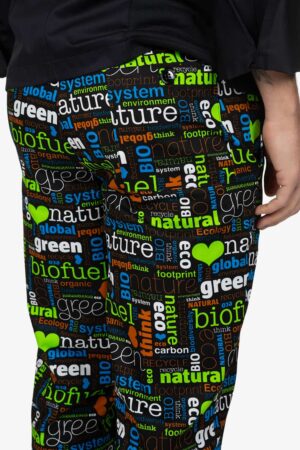 Pantalone con vita elasticizzata, in fantasia “bio”. Chiusura con bottone e zip. Due tasche laterali alla carrettiera e una tasca a toppa sul retro con abbottonatura. Vestibilità regular, con gamba dritta.