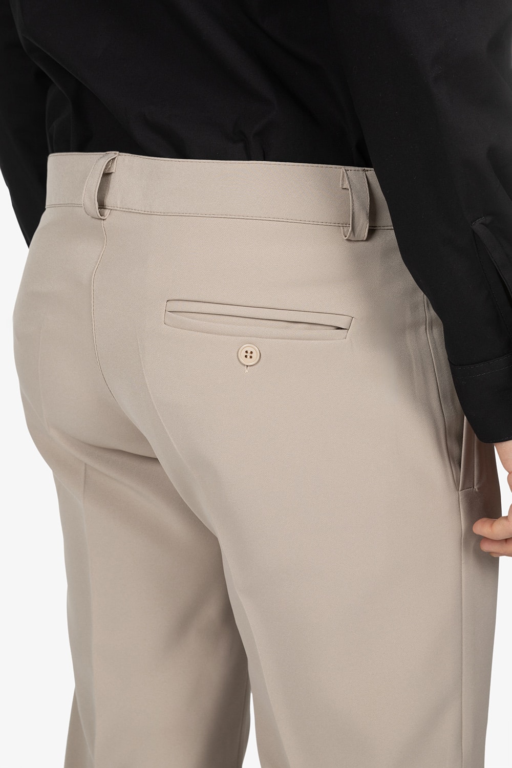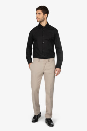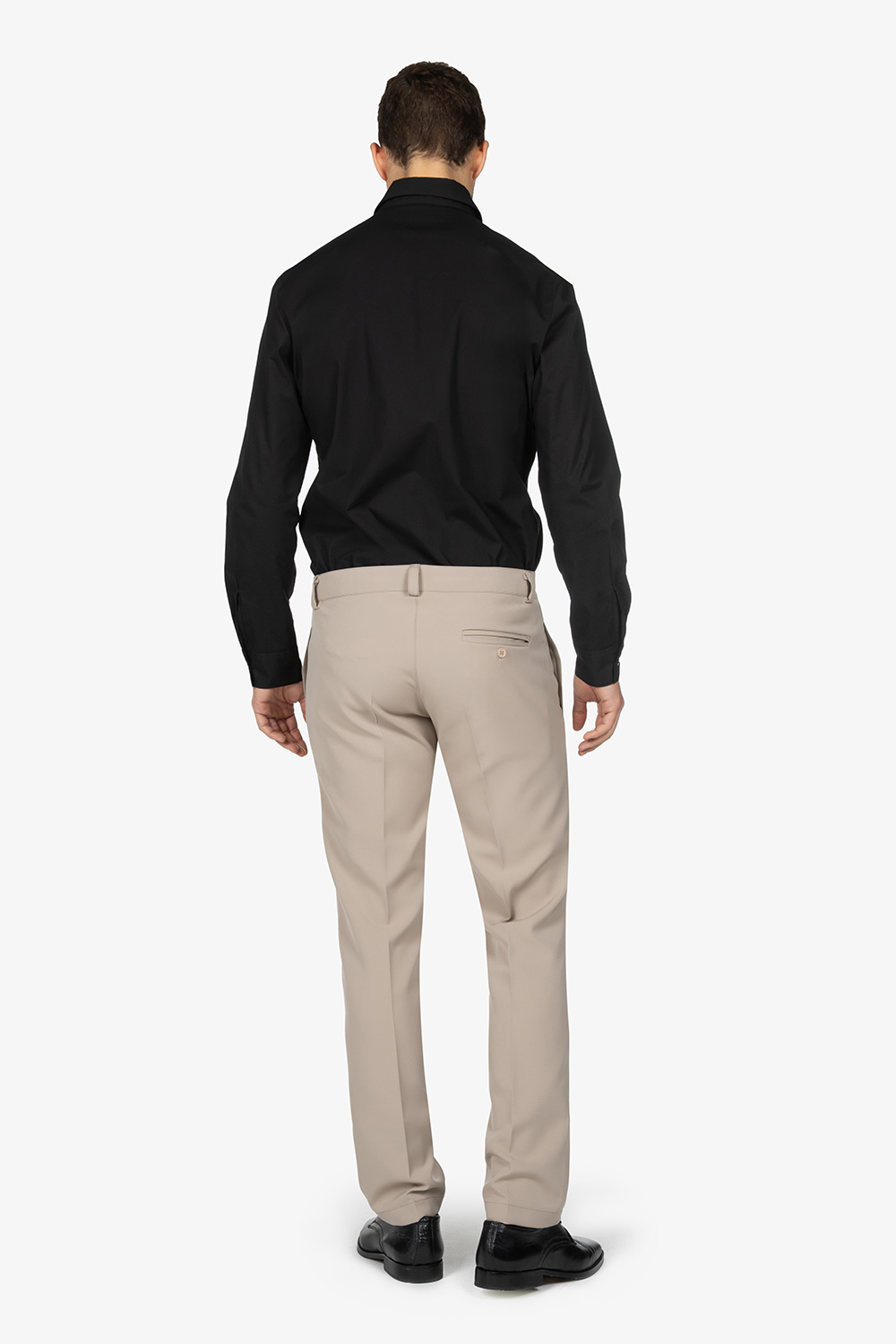Pantalone classico, in colore desert, con due tasche laterali e una tasca posteriore a filetto con bottone. Allacciatura frontale con bottone e zip. Passanti in vita. Vestibilità regular.