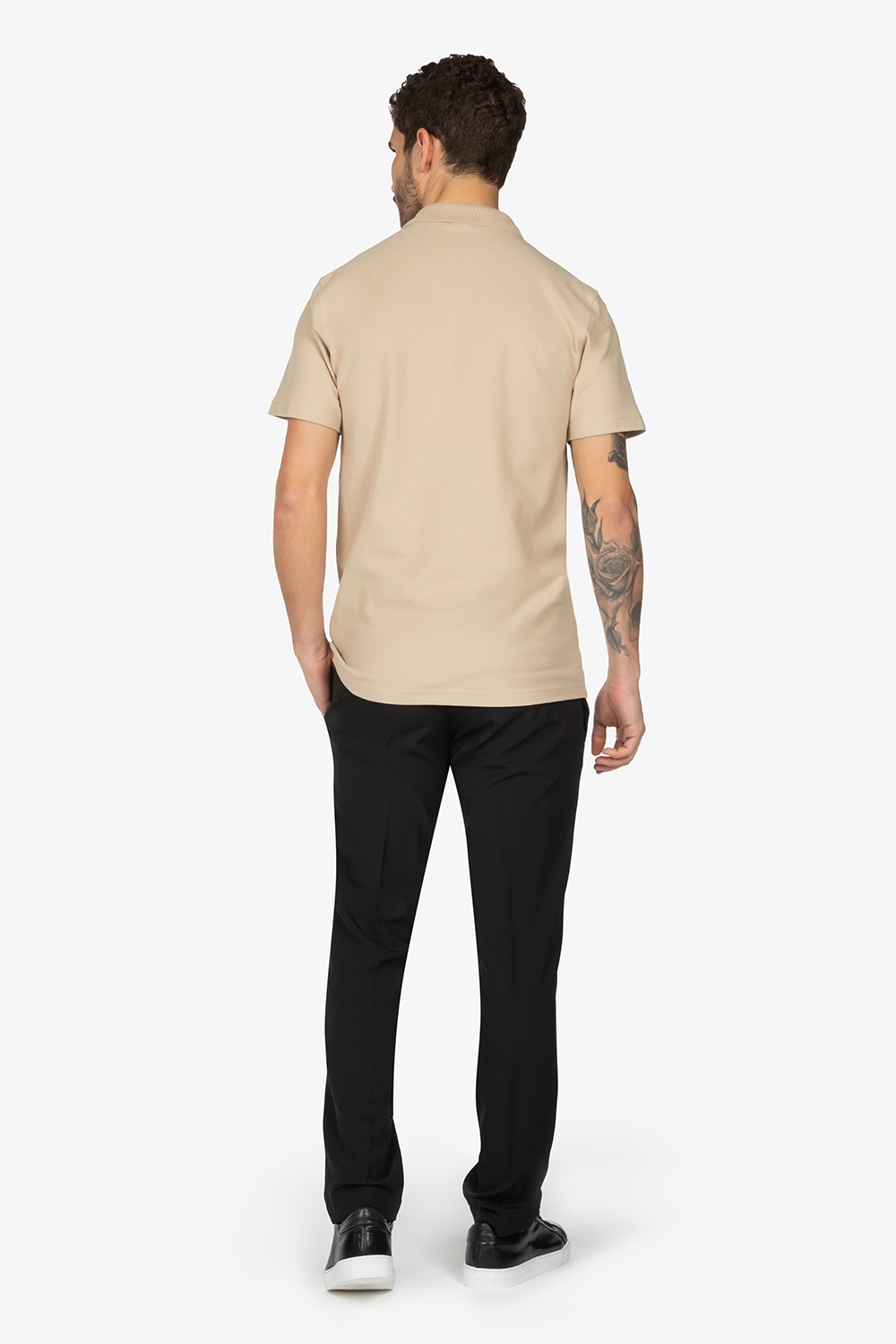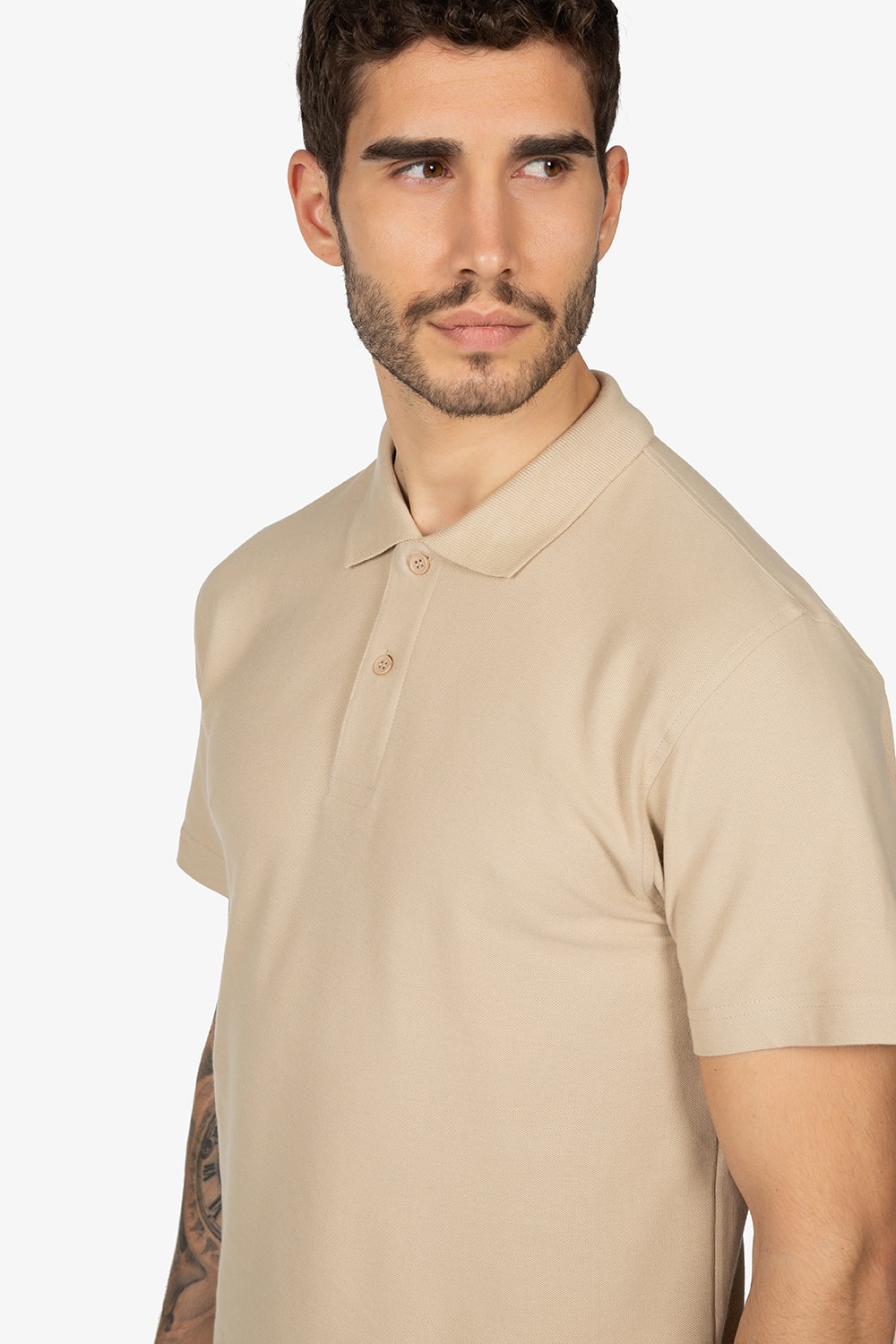 Polo beige con colletto a vela. Mezza manica. Chiusura con 2 bottoni. Vestibilità regular.