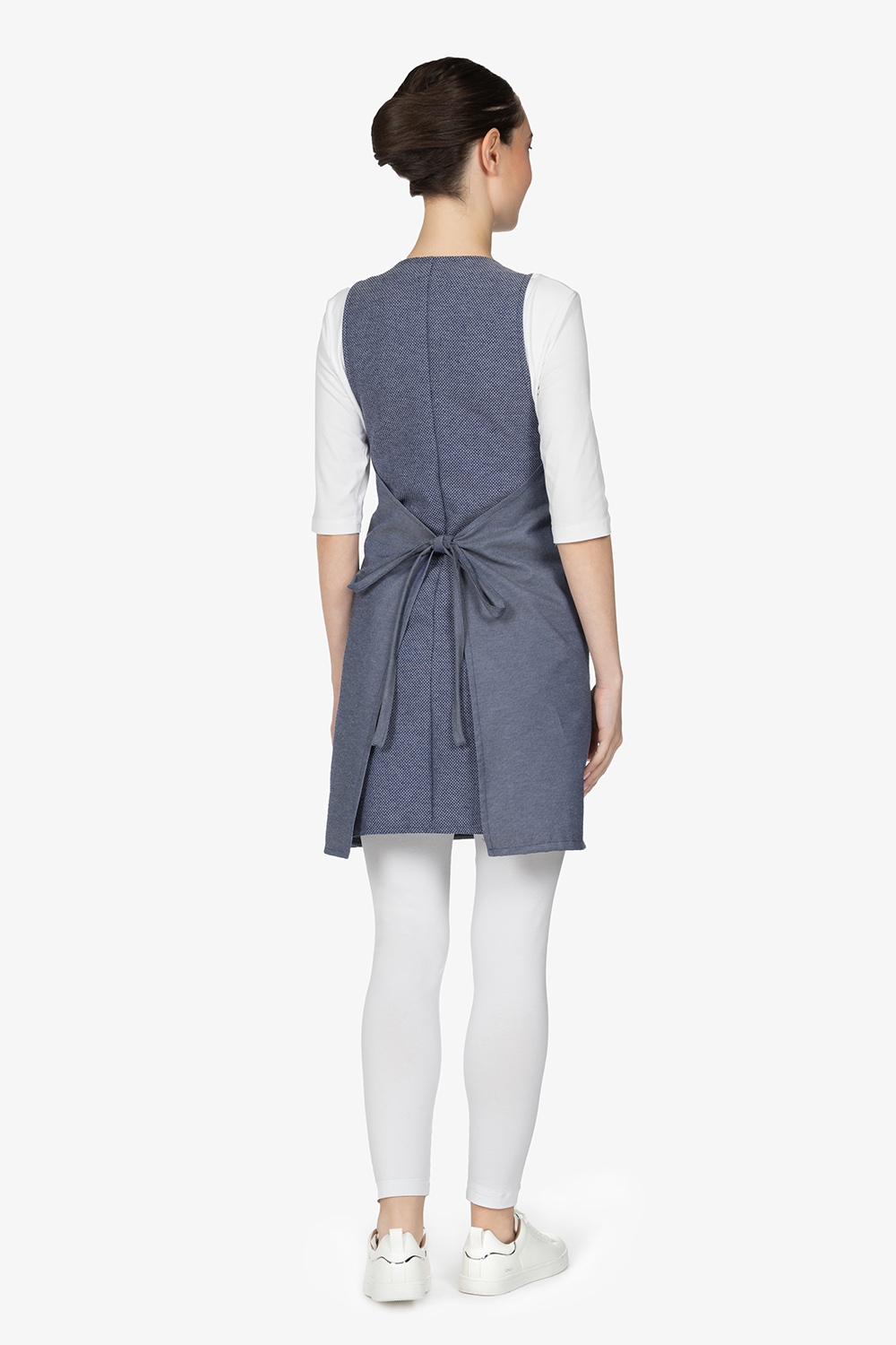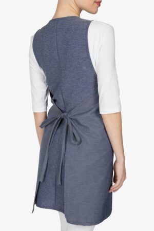Scamiciato con scollo a U. Bicolore: effetto “blu jeans” sul fronte e melange blu sul retro. Tascone centrale diviso in due. Allacciatura posteriore con fiocco. Vestibilità regular.