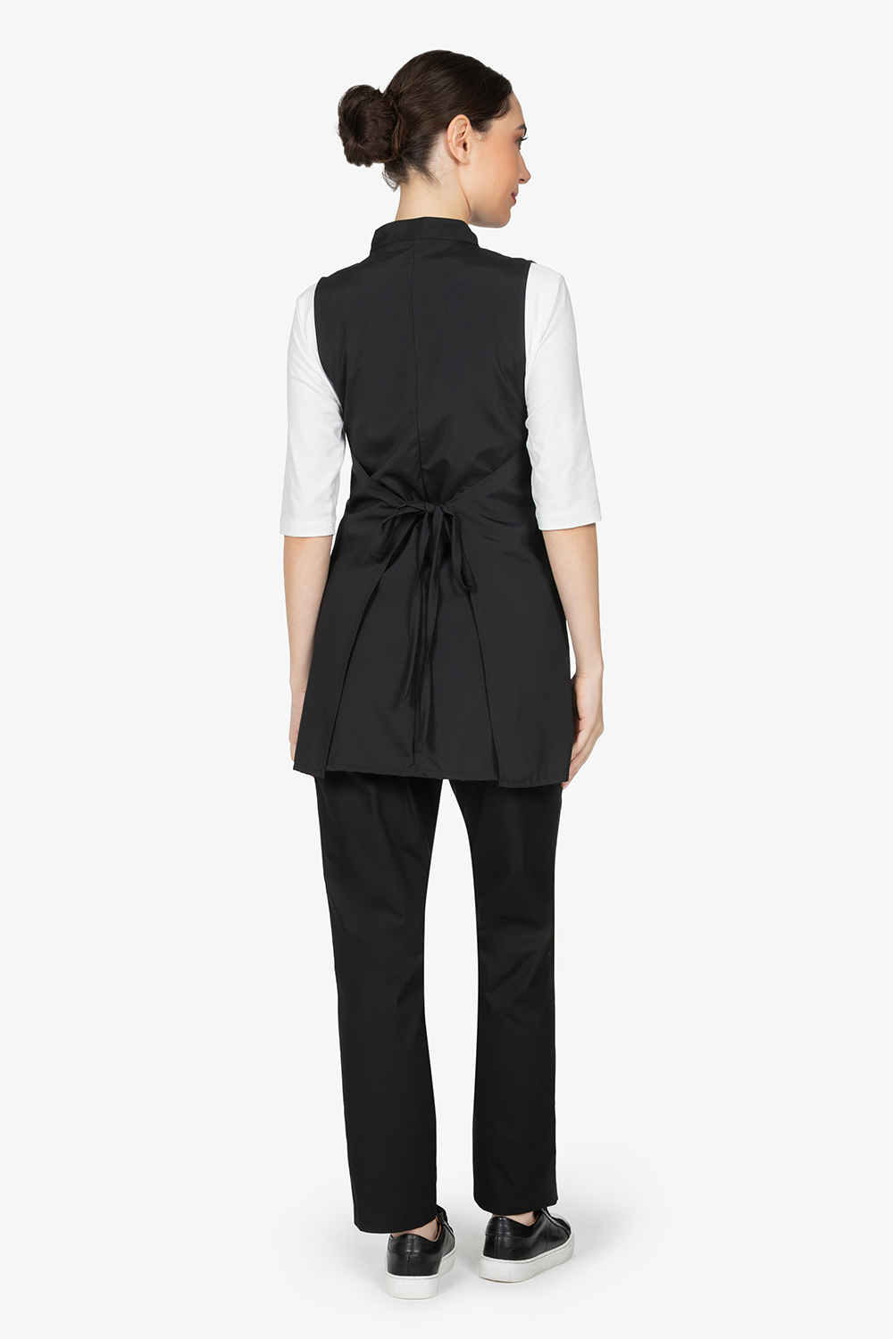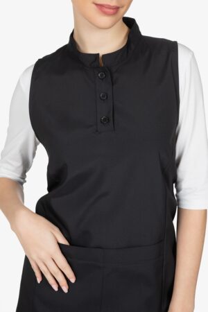 Scamiciato nero con colletto alla coreana. Due bottoni. Tascone centrale diviso in due. Allacciatura posteriore con fiocco. Vestibilità regular.
